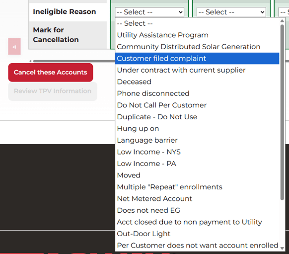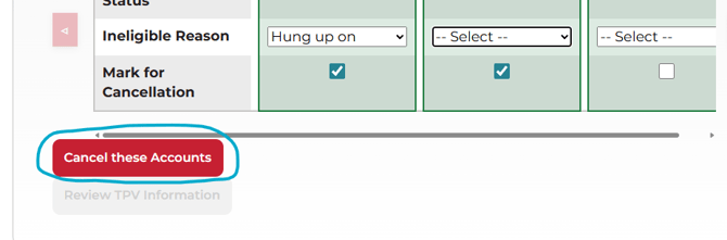 Once you have selected the ineligible reason and checked all applicable accounts, click the "Cancel these Accounts" button.