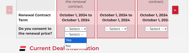 For each account that shows a renewal is available, a dropdown field labeled "Do you consent to the renewal price?" will appear in the last row of the Renewal Deal Information table.