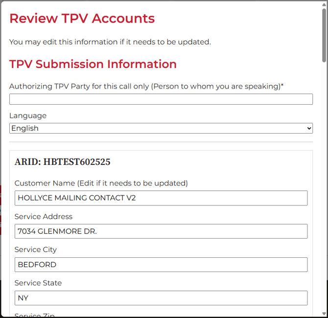 - Authorizing TPV Party (Required) — Enter the full name of the person you are speaking with on the call. This is the person who will be authorizing the renewal.