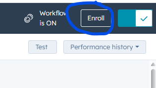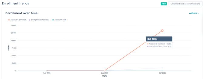 - Check the Performance screen to confirm the number of Accounts you imported matches the number of Accounts enrolled in the workflow. The orange dot on the line graph will show the exact number: https://app.hubspot.com/workflows/40211458/details/1654378569/performance