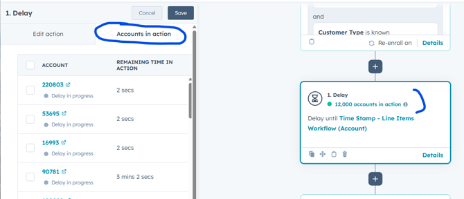 - Immediately after the import finishes, check to confirm that the first few accounts enrolled in the workflow. All of the accounts will enroll at the same time, then they will sit in the delay step until the time stamp is reached. https://app.hubspot.com/workflows/40211458/platform/flow/1654378569/edit