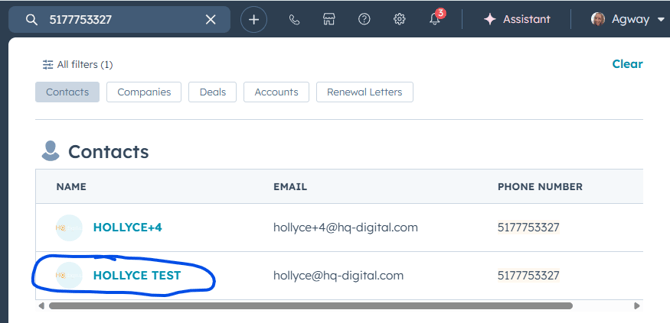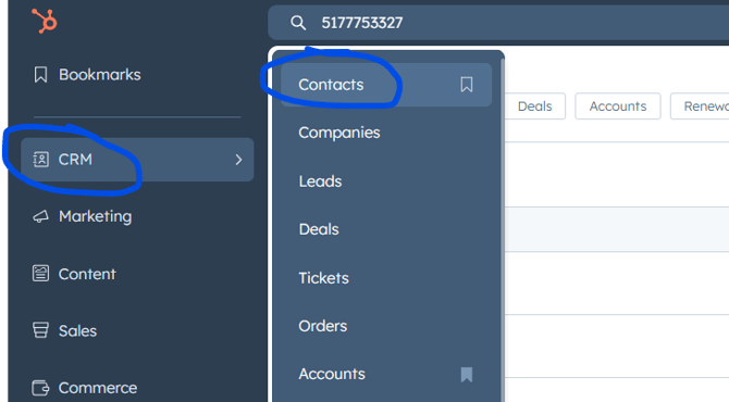 - Search for the Contact who is on the phone. Use the global search at the top of the HubSpot window. Phone number is the most accurate way to search, but you can also search by name or street address.