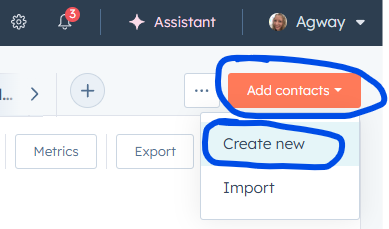- Then, click the orange "Add contacts" button in the upper right and select "Create new."
