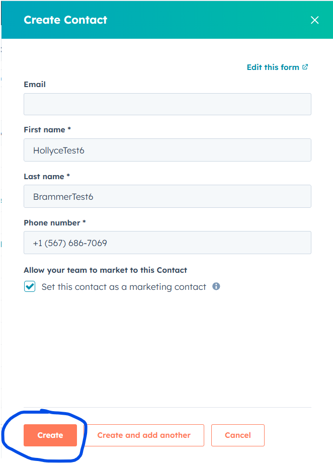 - A form like this will appear. Start typing in one of the fields for the rest of the form to appear. "Email" is not required. Please check the box to set the contact as a marketing contact; this setting allows Agway to email them. Click the orange "Create" button.