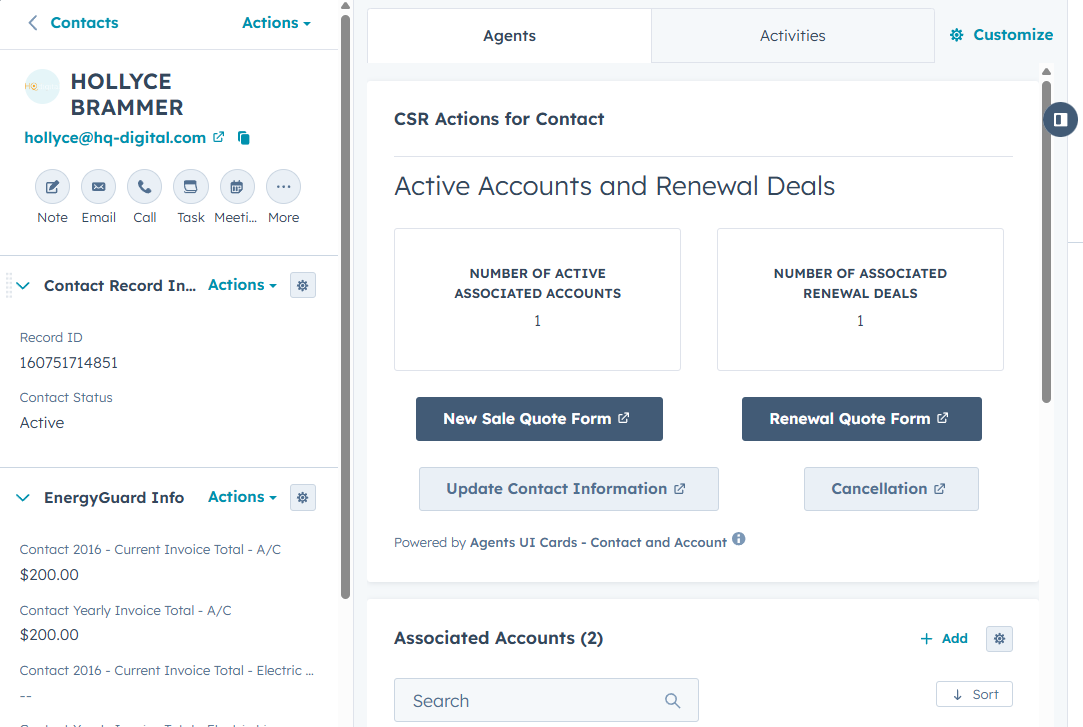 - This test contact already had two associated Accounts as you can see from the screenshot. But, let's say that she wants to sign up for a new Service Address. Click the "New Sale Quote Form" button.